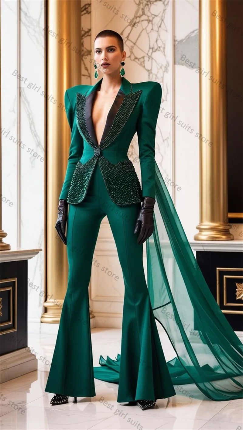 Green Crystals Women Suit Set 2 Piece Beaded Blazer Pants Trouser Long Train Formal Office Lady Jacket Customized Wedding Tuxedo
