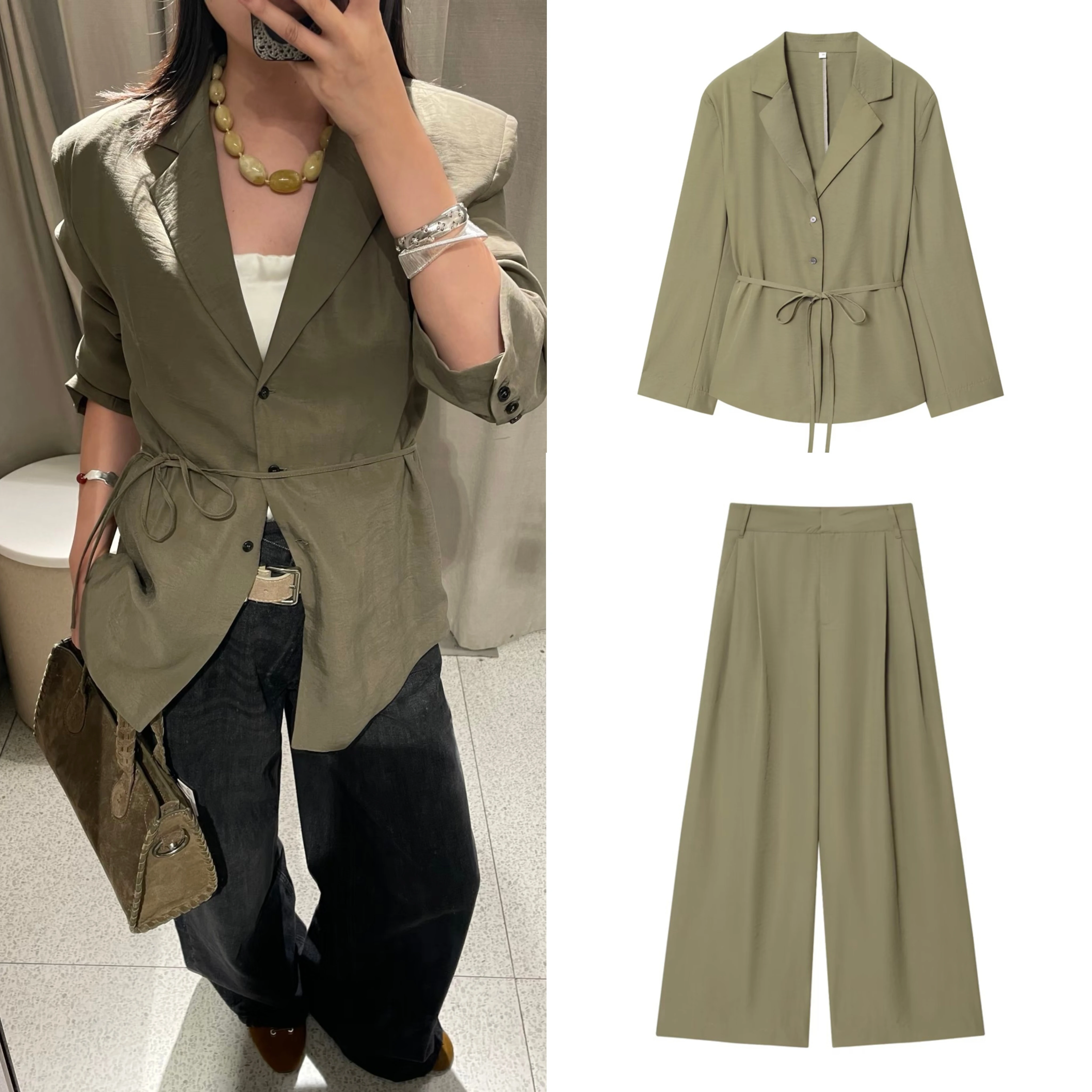 2025 Women's New Suit Fall Army Green Long Sleeves with Shoulder Pads Lace-up Blazer Pants Suit Casual Fashion Simple Personal