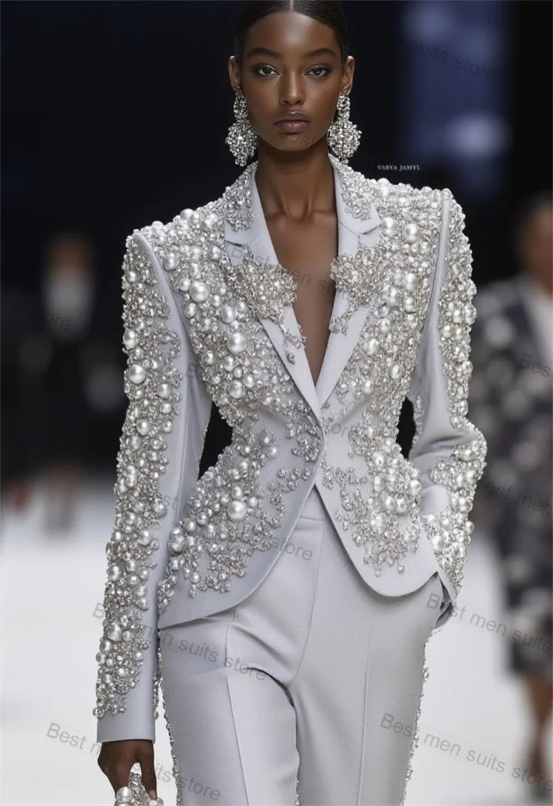 Luxury Shiny Women Suit Set 2 Piece Pearls Blazer+Pants Trousers Formal Office Jacket Cotton Customized Wedding Tuxedos Coat