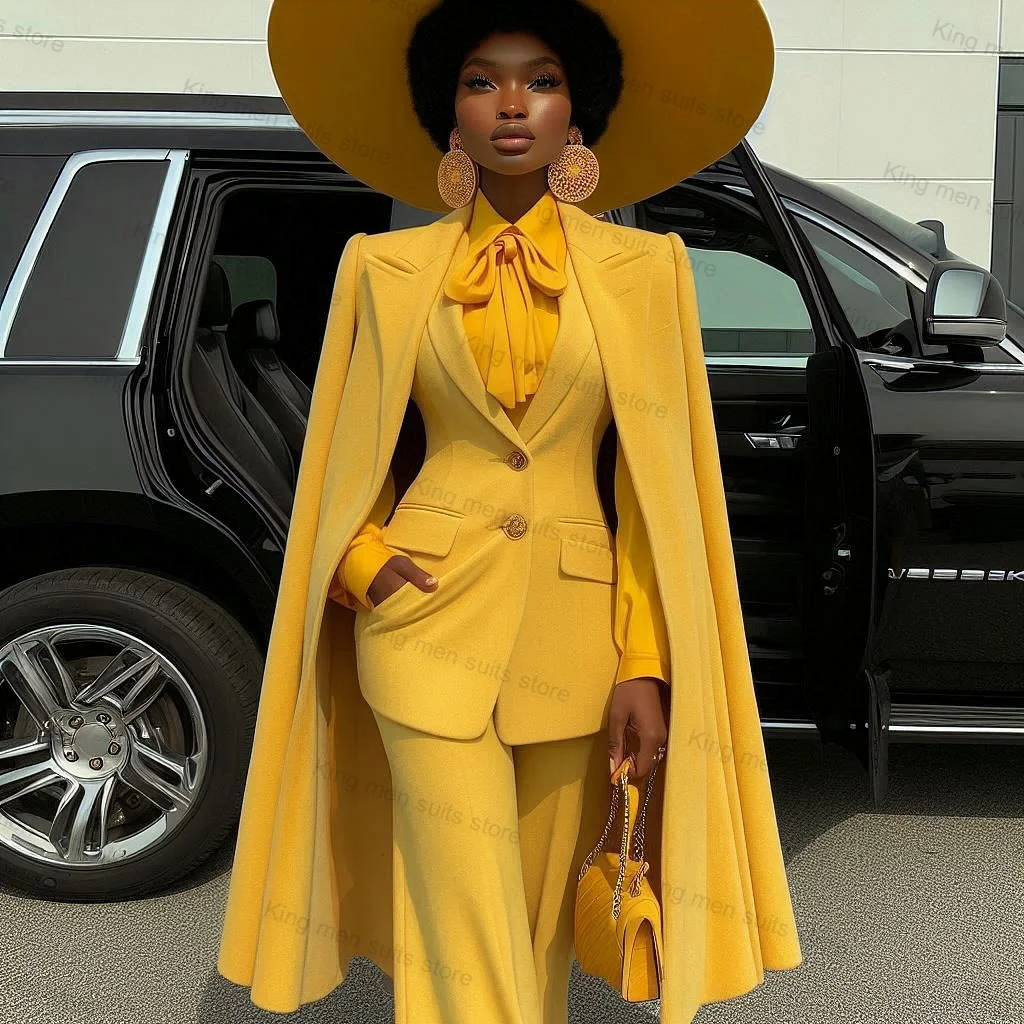 Yellow Cape Women Suit Pants Set 2 Pieces Long Sleeves Blazer+Trousers Cotton Customized Formal Wedding Tuxedos Jacket Prom Coat