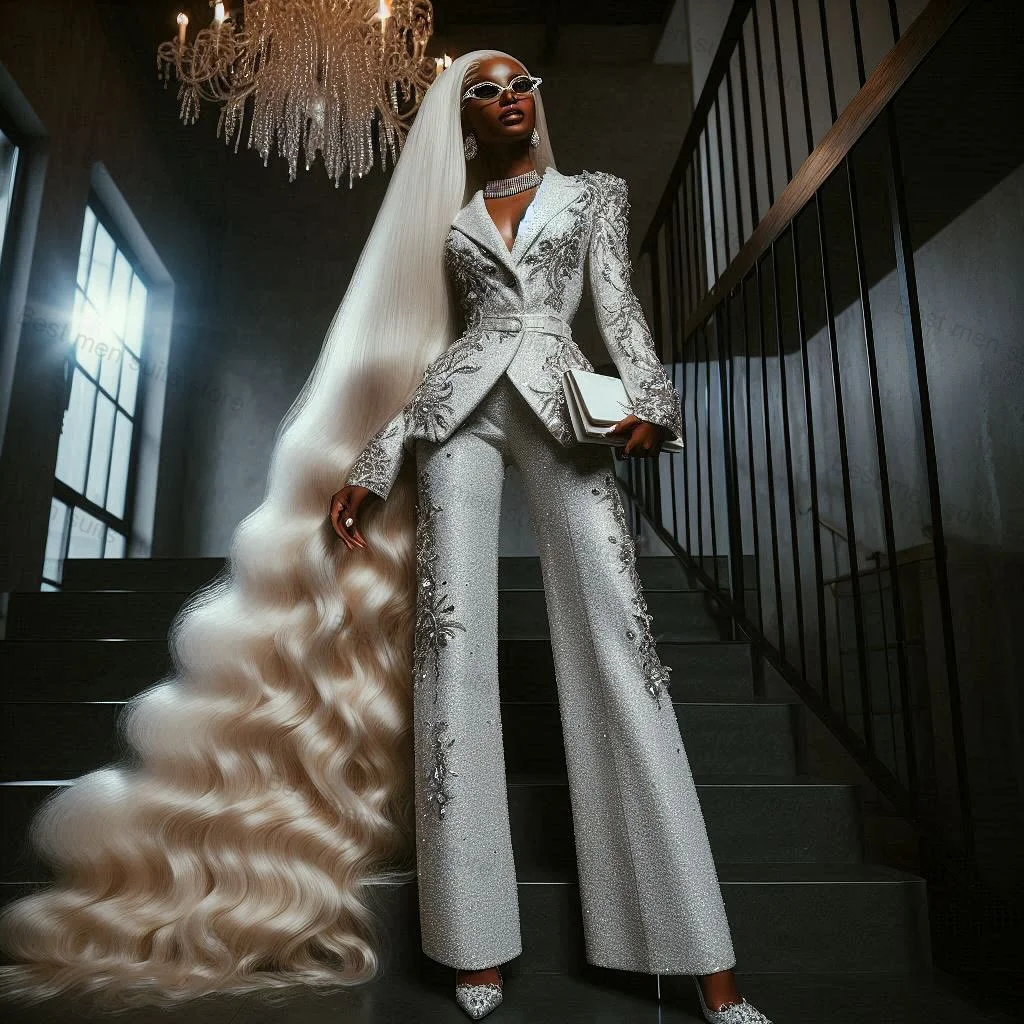 Shiny Silver Crystals Women Suit Set 2 Piece Blazer+Trousers Belt Formal Office Lady Wedding Tuxedos Customized Prom Coat Jacket  Read more