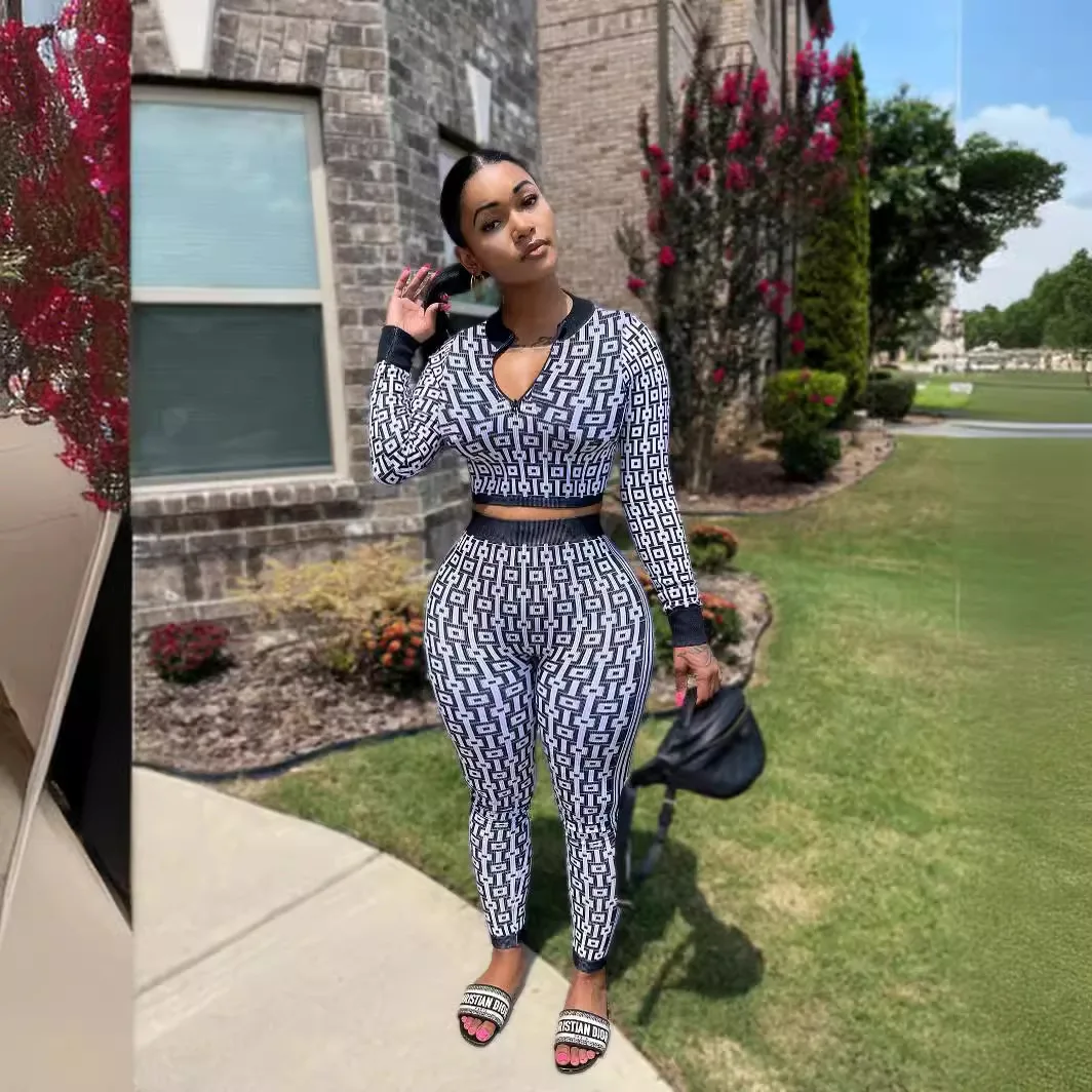 Autumn And Winter Women's Stretch Knitted Printed Women's Suit Long-sleeved Tight Sports Yoga Two-piece Set For Women  Read more