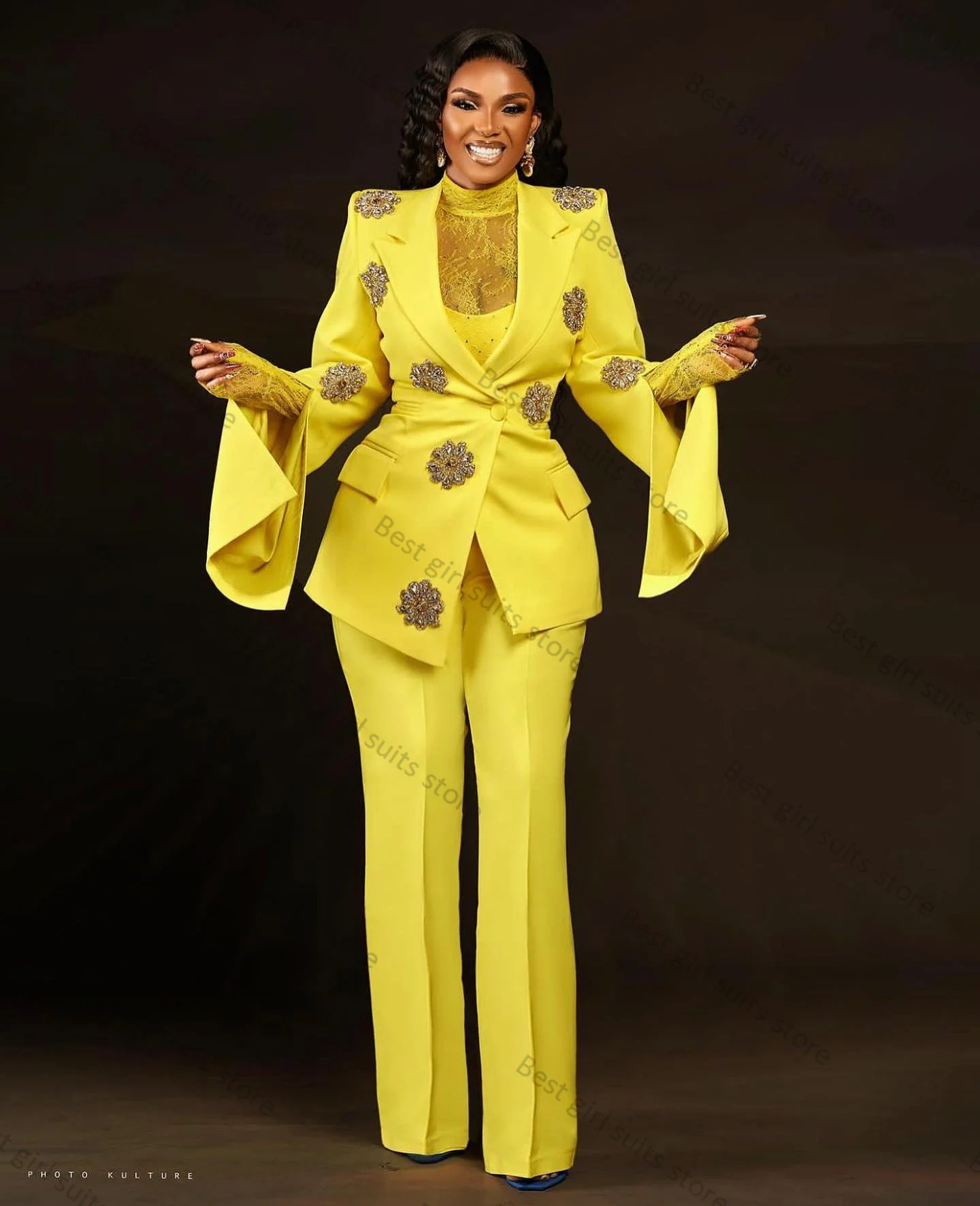 Yellow Crystals Women Suit Pants Set 2 Piece Blazer+Trousers Cotton Business Formal Office Jacket Customized Wedding Prom Coat  Read more