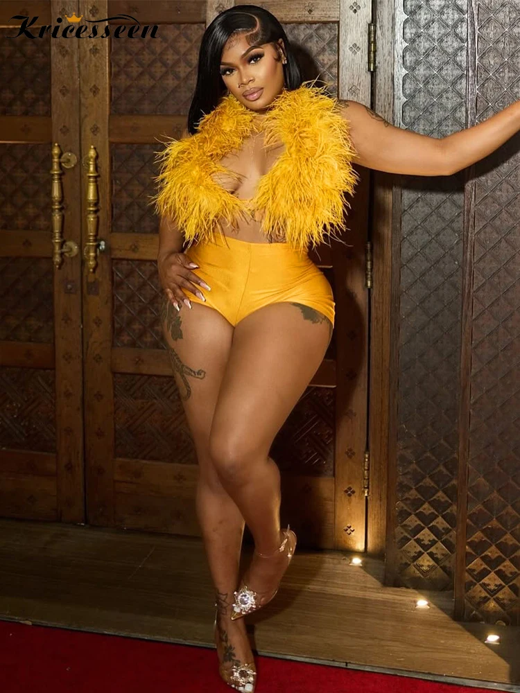 Kricesseen Women's Furry Suits Set 2 Piece Outfits Summer Halter V Neck Backless Crop Top And Stain Matching Shorts Set Clubwear