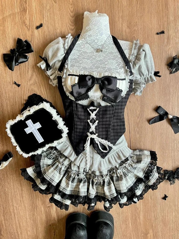 France Fashion Gothic Patchwork Slim 3-piece Set Women Summer Design Bow Short Sleeve Suit Female Darkly Vintage Thin Outfits
