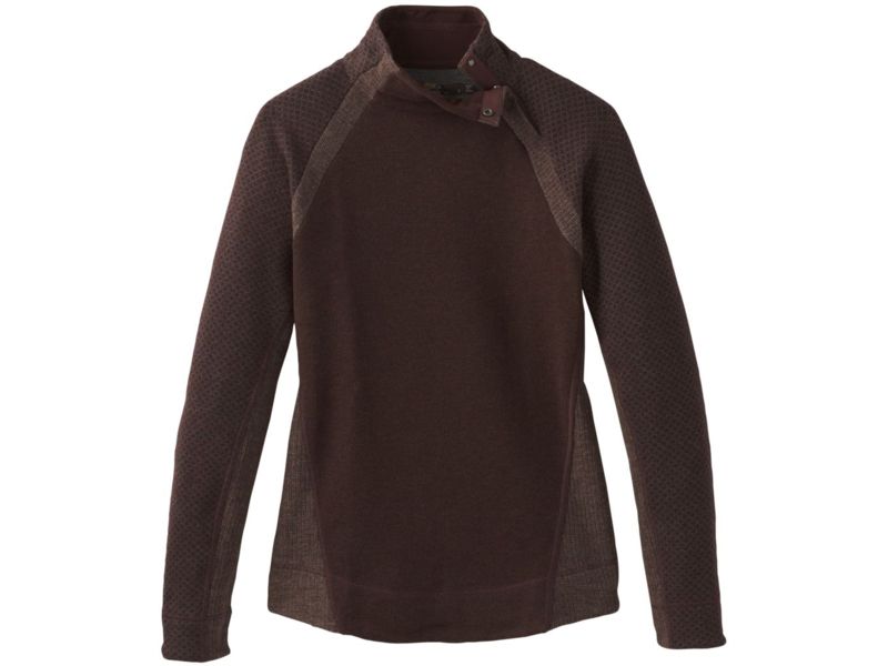 prAna Brandie Sweater - Women's Cocoa Heather Extra Small W23180549-CZHT-XS. Features/Specifications: Recycled wool blend sweater ; Dual silhouette snap button collar ; Sueded fleece lined collar ; Curved hem design detail ; Standard fit ; Fabric...  Read more