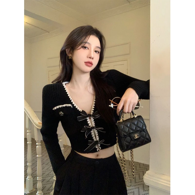 MEXZT Vintage Knitted Cardigan Women Bow V Neck Cropped Sweaters Korean Elegant Slim Knitwear Y2K Black Casual Jumpers Coats New