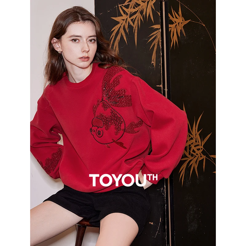 TOYOUTH Women Fleece Hoodies Sweatshirt 2024 Autumn and Winter New Koi Embroidered Thicking Warm Round Neck Pullover Tops Red