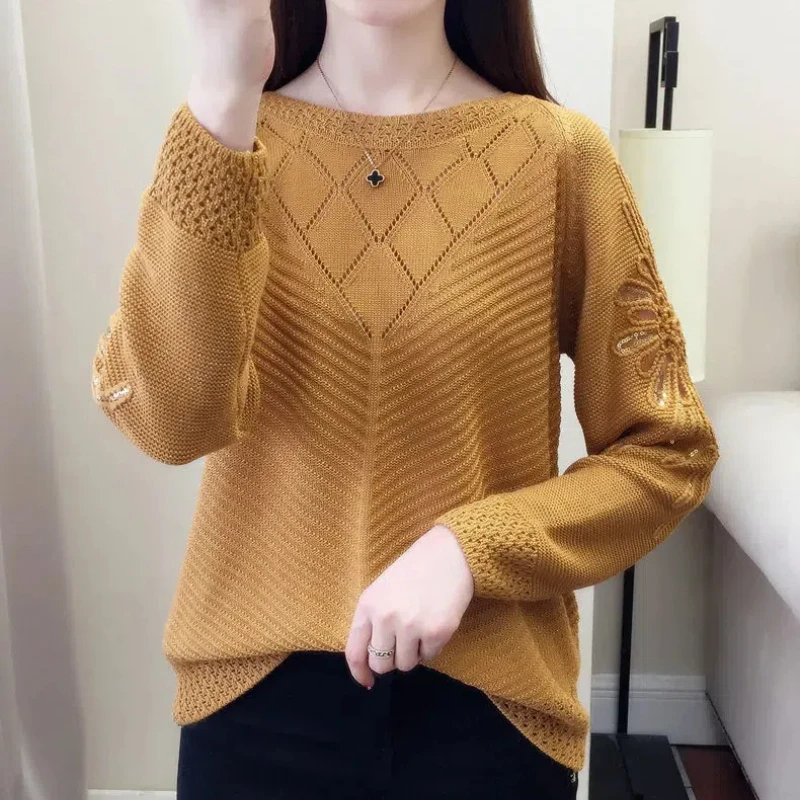 Temperament Spring Autumn New Sweaters Women's O-Neck Lace Embroidered Hollow Out Fashion Long Sleeve Pullovers Knitted Tops