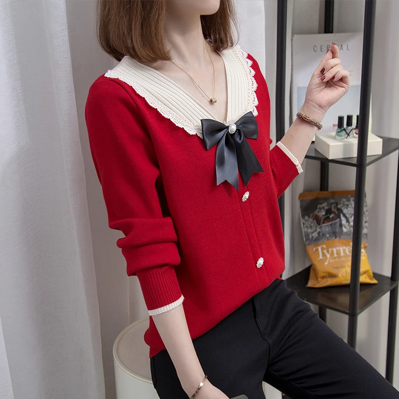 4XL Big Size Sweater Women V collar Bow Knitted pullove Long sleeve Patchwork Button Casual Loose soft Women clothing 2022