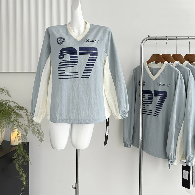 Streetwear Retro V Neck Sweatshirt Women American Y2K Patchwork Long Sleeve Loose Pullover Female Spring New Letter Print Tops