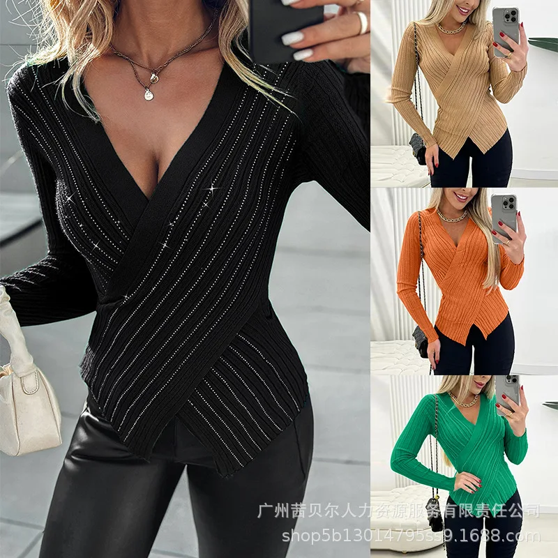 Women Tops Full Sleeve V Neck Sweaters Pullover Diamonds Spliced Striped Slim Fit Jumpers Casual Elegant Lady Patchwork 2024  Read more