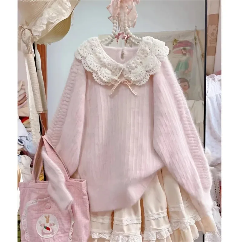 Autumn Winter Sweet Kawaii Peter Pan Collar Patchwork Sweater Women Japanese Fashion Vintage Knit Tops Y2k Cute Bow Pullover