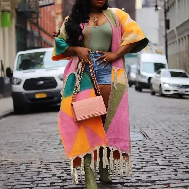 Autumn Winter Knitted Sweater Cardigan Cloak Cape Women Outerwears Patchwork Tassel Hem Open Stitch Loose Straight Gothic Coats
