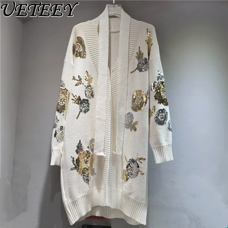 Designed Beaded Embroidery Mid-Length Thin Knit Cardigan Autumn Winter New Elegant Fashion Long Sleeve Versatile Sweater Coat