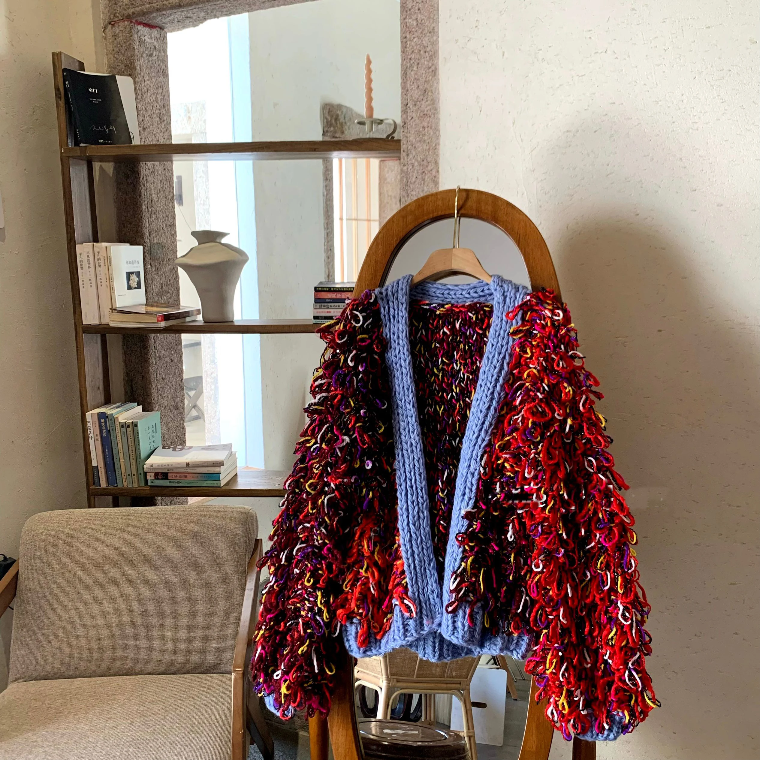 Handmade Chunky Knit Fringe Cardigan Colorful Oversized Sweater Boho Chic Cottagecore Knitwear Dopamine Dressing Fashion
