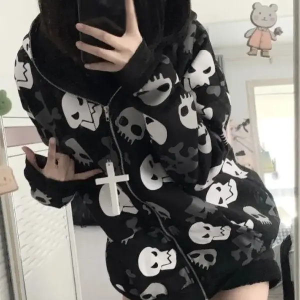 Gothic Harajuku Punk Skull Hoodies Women Mall Goth Tops Streetwear Y2K Black Long Sleeve Zip Up Hooded Sweatshirt 2025 Autumn