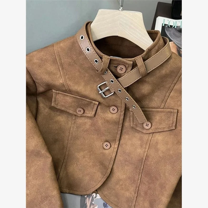 American Retro Desert Wasteland Sle ort Leather Jaet Women's Spring Autumn Tall Brown Open Cardigan Top Faionable