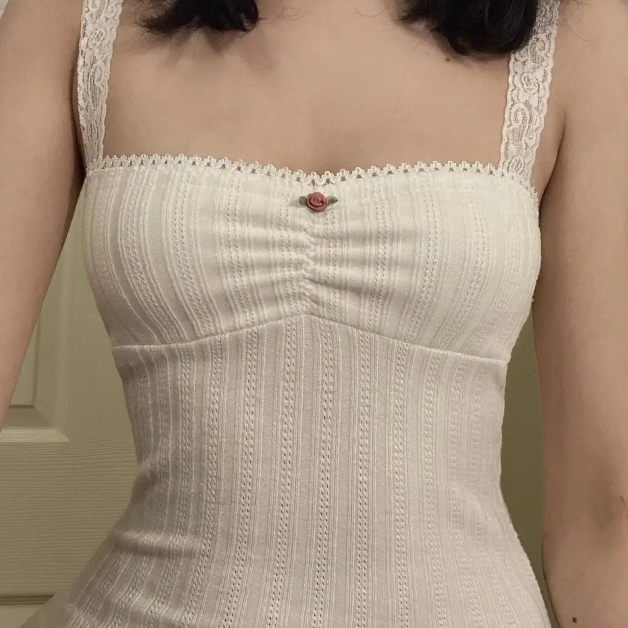 Combhasaki Women's Summer Y2K Sleeveless Summer Cute Sling Vest White Backless Lace Spaghetti Straps Slim Fit Striped Crop Tops