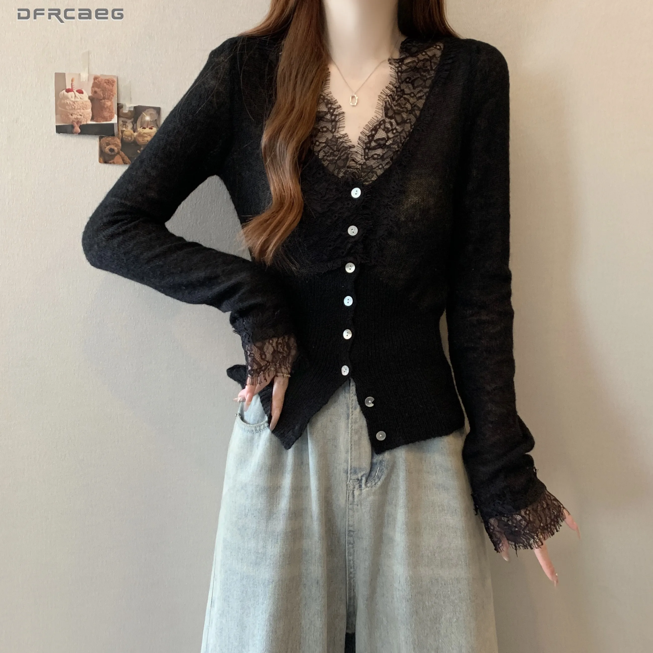 White Thicken Knitted Shirt Top Woman Autumn Winter Lace Patchwork Slim Long Sleeved Cardigan Bottoming Sweater Clothes