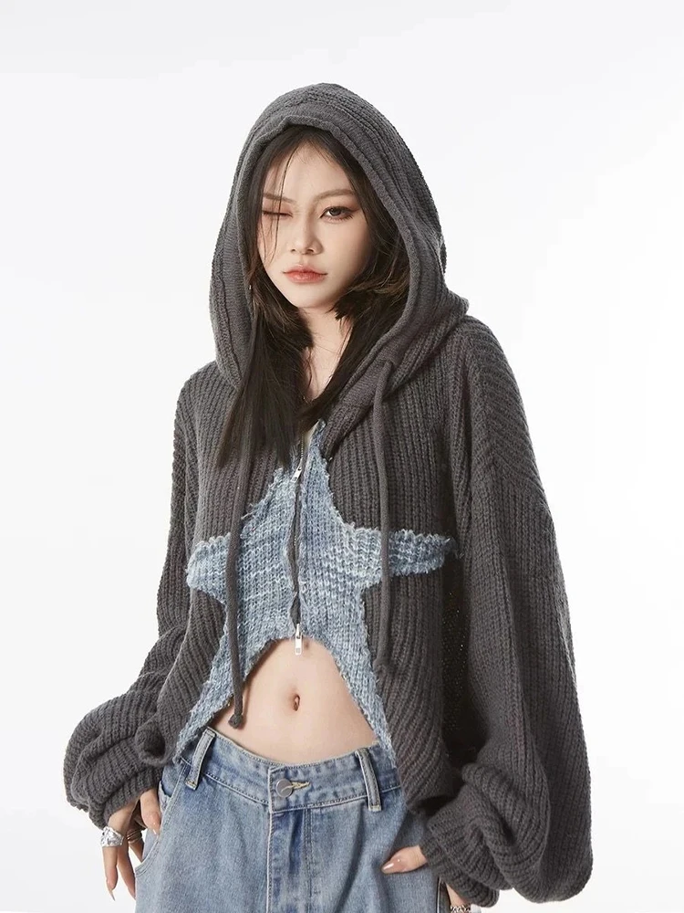 Y2K Hooded Women Sweaters Autumn American Streetwear Star Vintage Crop Knitted Cardigan Irregular Double Zipper Lace Up Jumpers