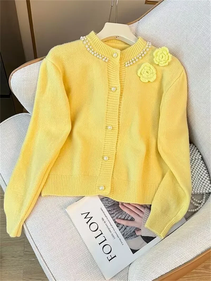 Cardigan Sweet Three-dimensional Flower Beaded Long-sleeved Knit Cardigan Women's Autumn Age-reducing Loose Joker Short Sweater