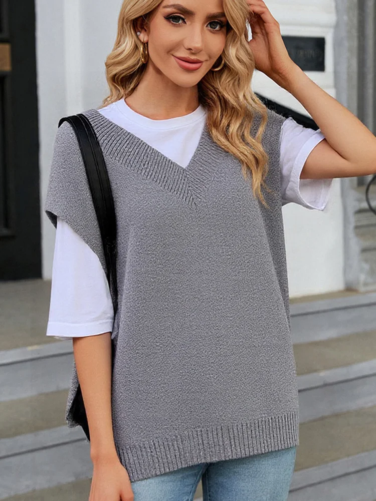 2023 Autumn and Winter Women's Pullover V-neck Patchwork Screw Thread Loose Solid Sweater Fashion Casual Sleeveless Vest Tops