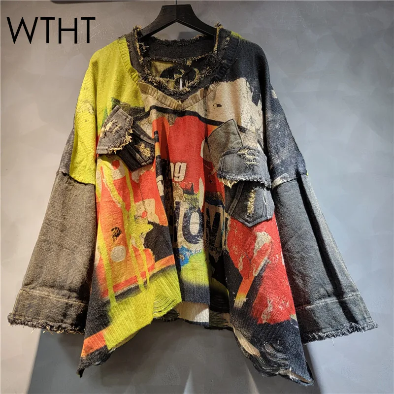 WTHT Vintage Women's Spliced Pockets Print Burr Edge Sweater Fashion Long Sleeves O-neck Pullovers Female 2025 Summer 1LS1736