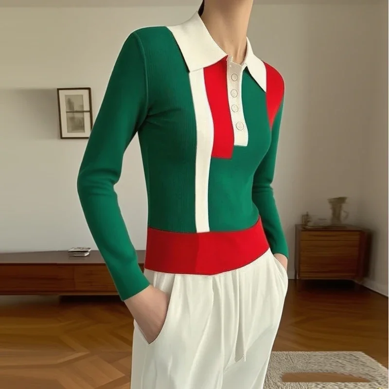 Modigirl Autumn Winter Knit Sweater Tops for Women 2025 Contrast Color Buttoned Skinny Woman Long Sleeves Pullovers Clothes