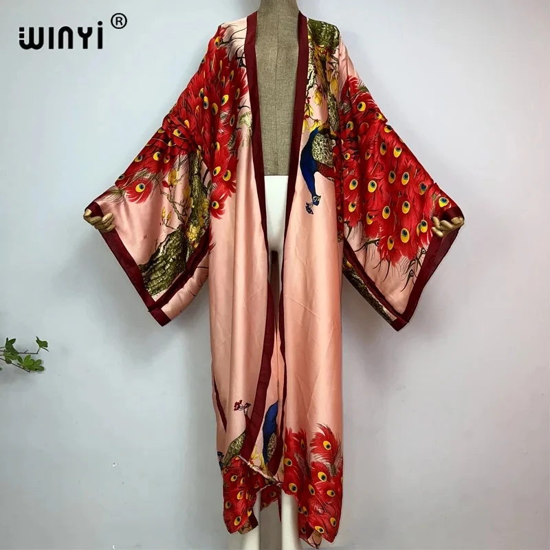 WINYI 2024 High-quality Double-sided Print Silk feel Dress Beach Wear Boho Cardigan abaya women muslim dress Long Sleeve Kimono