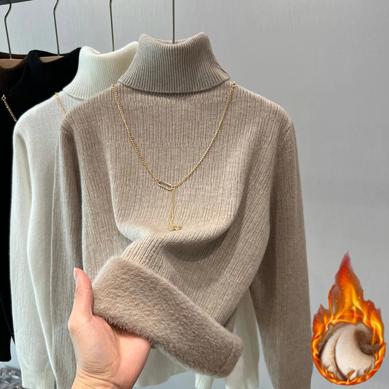 Turtleneck Winter Sweater Women Elegant Thicken Velvet Lined Warm Sueter Fleece Knitted Pullover Slim Top Jersey Jumper Knitwear