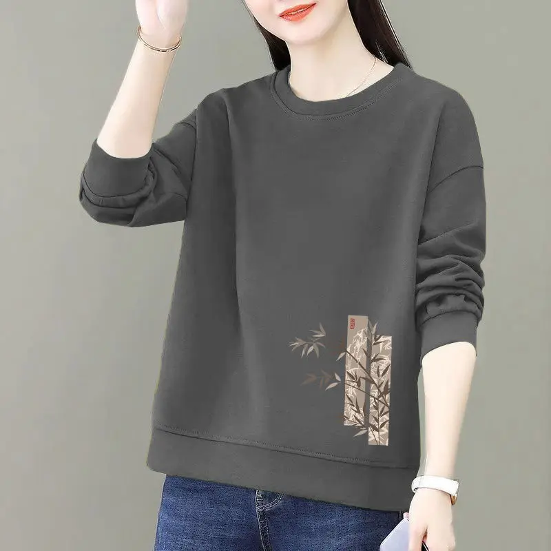 All-match Lantern Long Sleeve Round Neck Plant&Flowers Printing Pullover Women's Loose Fashionable Spring Autumn Hoodies Tops