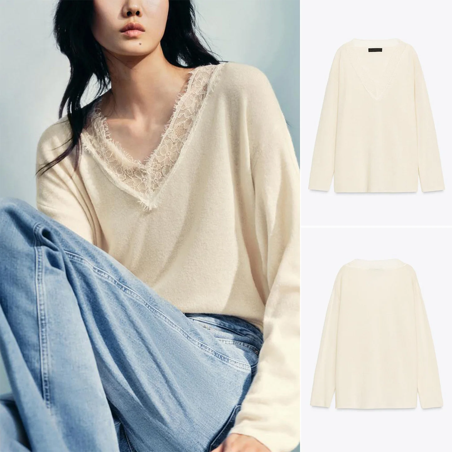 New Autumn Women's Simple Sle Long Sve Knitted Sweater V-Ne Lace Decorated French Sle Polyester Fiber Open Cardigan  Read more