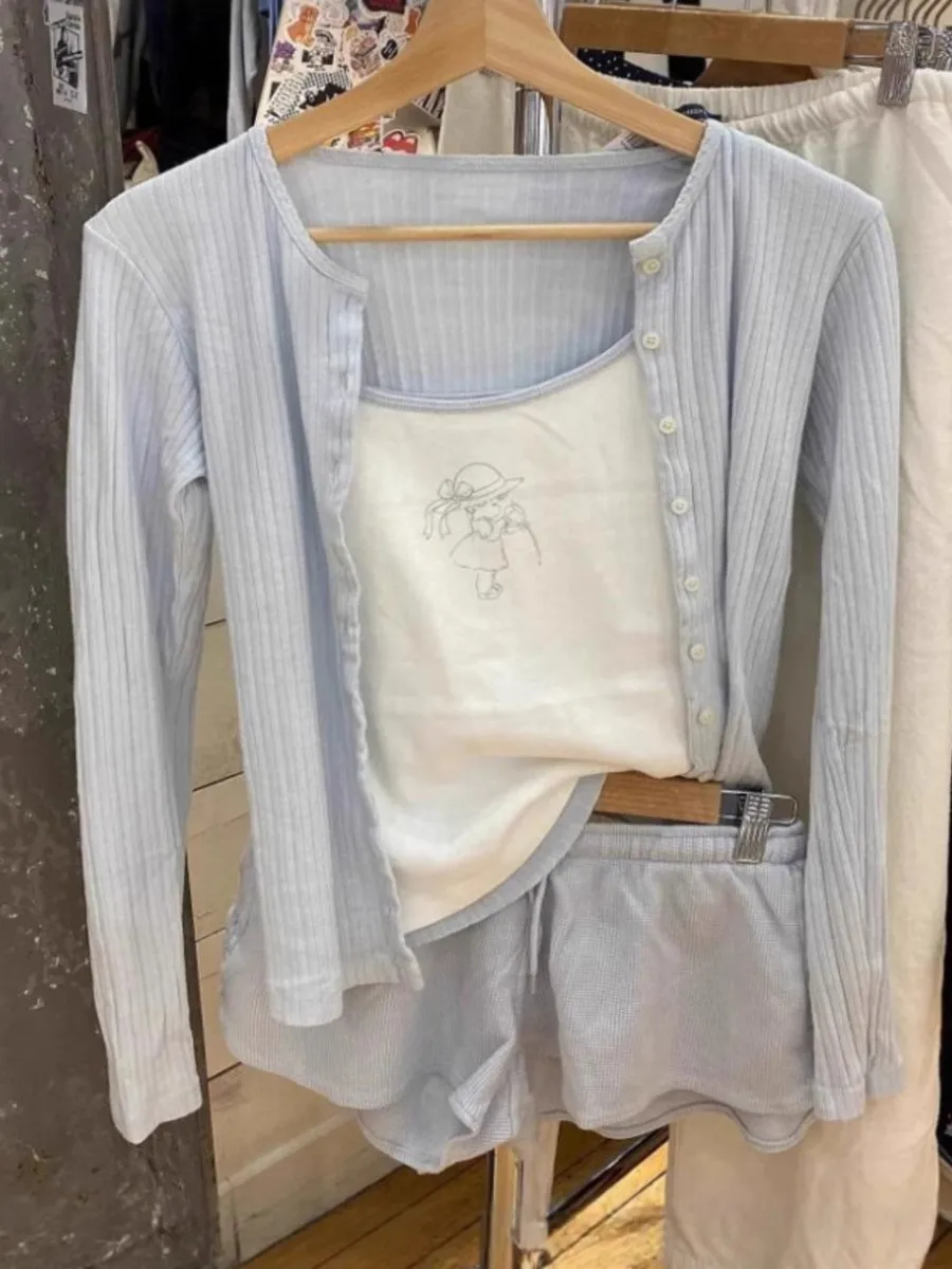 Blue Eyelet Long Sleeve Tee Women Casual Cotton Slim O-neck Single Breasted T-shirt Female Cute Sweet Preppy Style Tshirt Tops  Read more