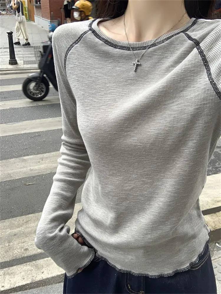 European and American women's sportswear and casual short-cut knitted high-elastic long-sleeved T-shirt top