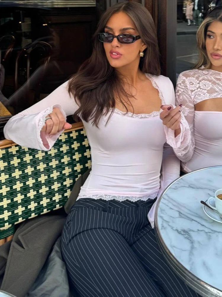 FDYOUI Lace Patchwork Long Sleeve T-shirts Streetwear Y2K Woman Clothes Casual Fashion Square Collar Slim Pink Tee Shirt Tops