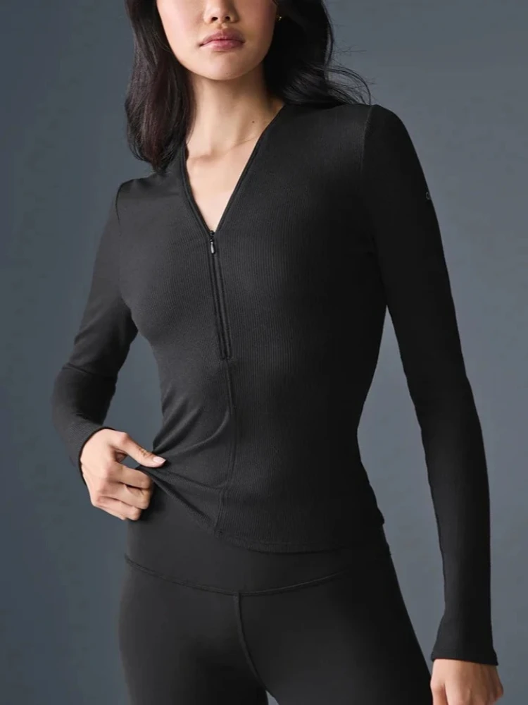2025 Autumn New Long-sleeved T-shirts Cotton Ribbed Zipper V-neck Slim Yoga Top Fitness Running Fitness Black Sports Women's Top  Read more
