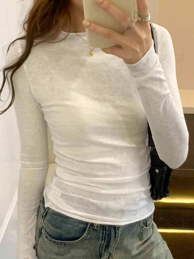 Spring Autumn T shirt Women Tops Solid Long Sleeve Ruched O Neck Tshirts Female Korean Casual Streetwear High Quality Base Tees