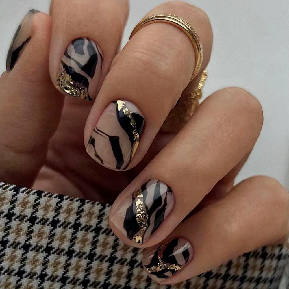 24Pcs Short Size quare with Black Stripes and Glitter Powder Girls Women Full Coverage Wearable Fake Nails Set