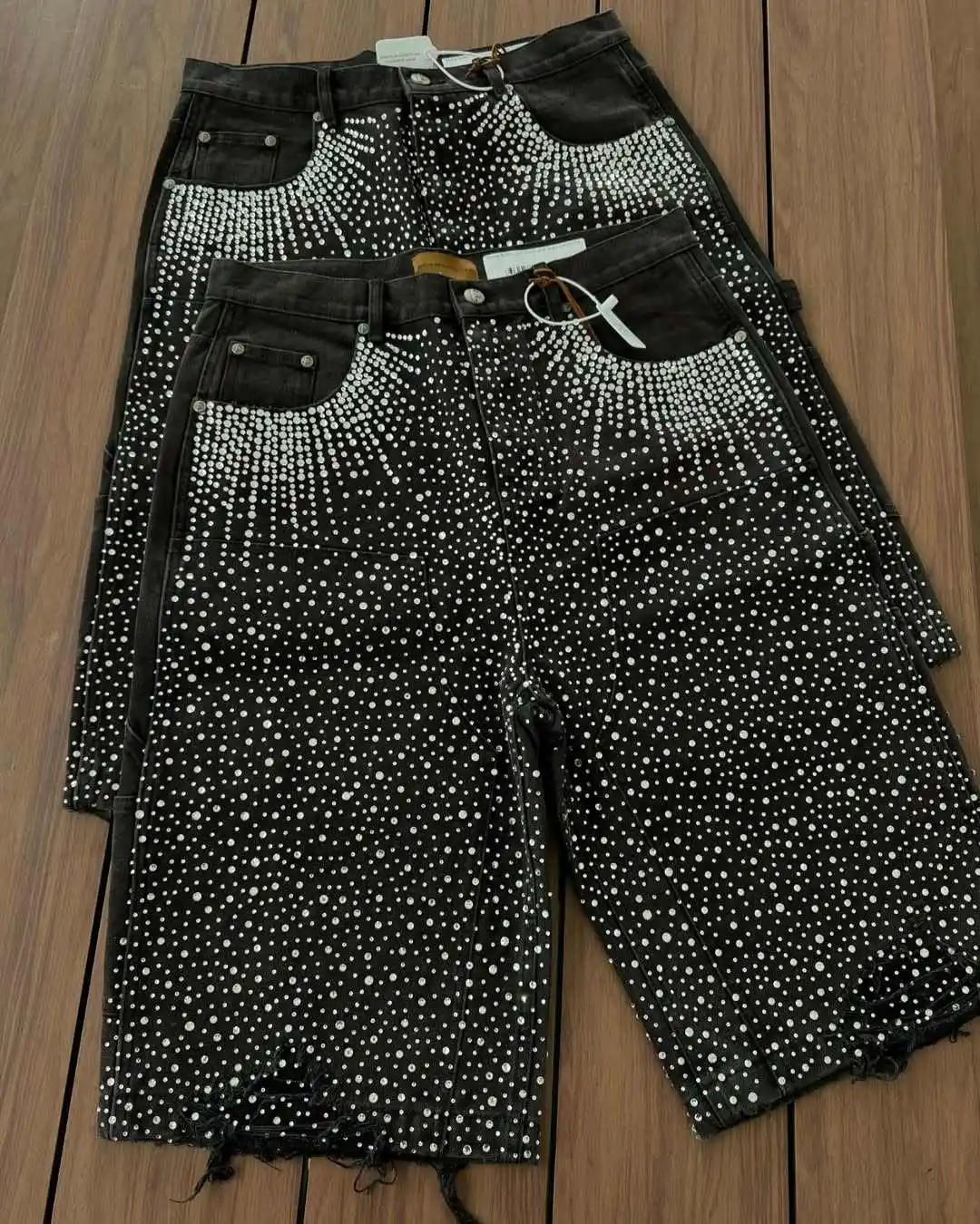 Y2k Streetwear Women Vintage Rhinestone Sequin Denim Shorts Jeans Hip Hop Baggy Denim Gym Shorts Casual Basketball Shorts