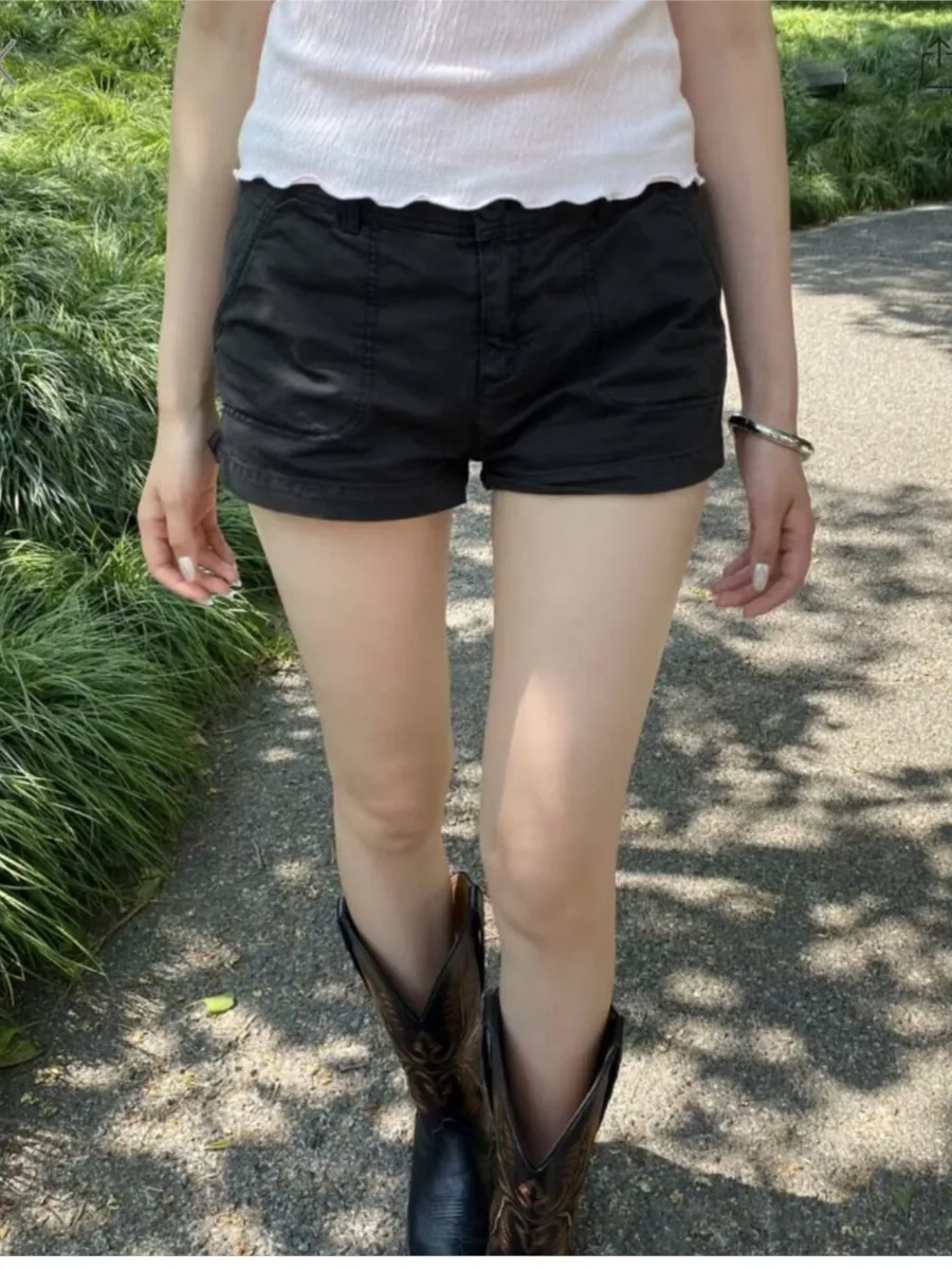 Vintage Black Short Pants Women Summer Cotton Casual Loose Pocket Button Elastic High Waist Sweatshort Sweet Chic Cargo Shorts