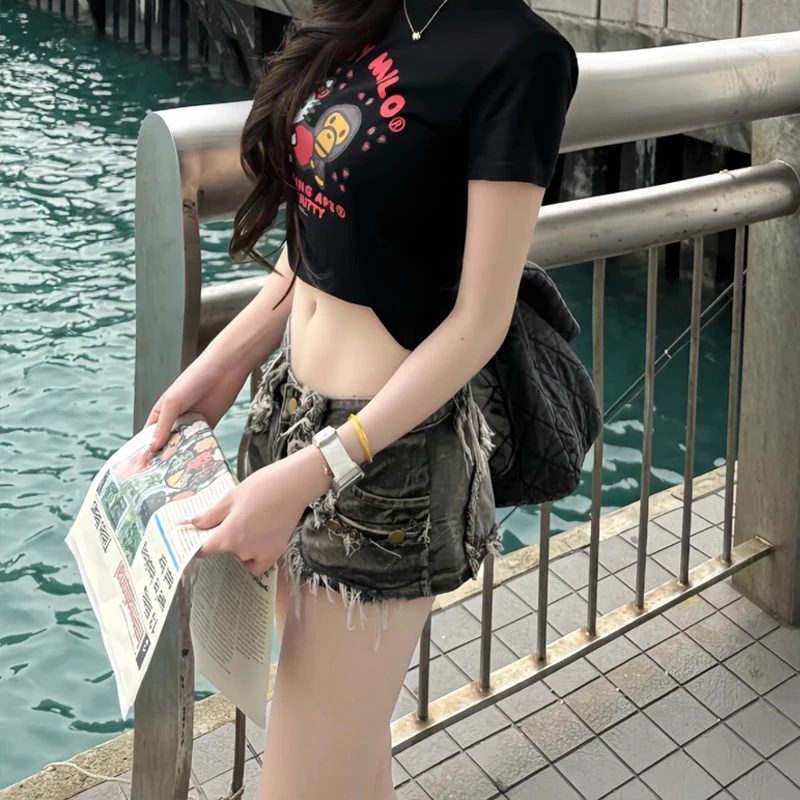 women's rough edge zipper strap ripped denim shorts y2k black hot pants jean shorts