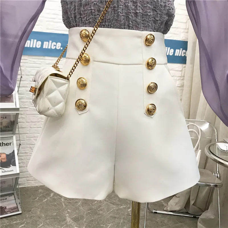 Spring Black White Shorts Women Double-breasted Casual High Waist A-Line Wide Leg Shorts Female Autumn