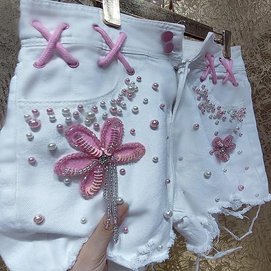 Luxury Handmade Pearls Beaded Tassels Hot Pants Flowers Embroidery Denim Shorts Pink Spicy Girl Cowboy Shorts Lace Up Trousers  Read more