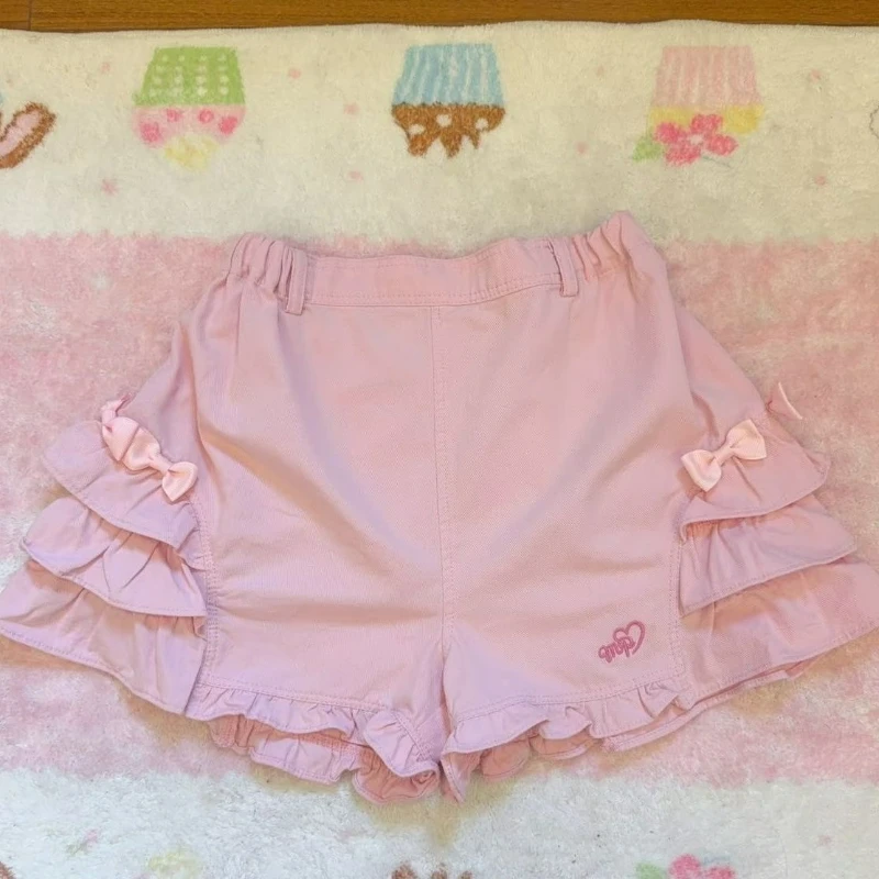 Pink Sweet Lolita Style Shorts Women Summer Kawaii Elastic Waist Ruffles Bow Short Pants Girl Japanese Y2k Aesthetic Cute Shorts