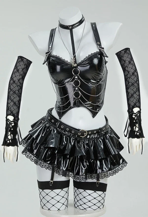 MEOWCOS Misa Gothic Black Lingerie Set Cami Top and Mini Skirt with Sleeves and Necklace Cosplay Costume for Halloween