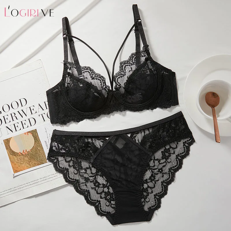 Logirlve Sexy Underwear Set Transparent Bras Plus Size Women Lace Lingerie Set Green Bra and Panties Sets Ultrathin Brassiere