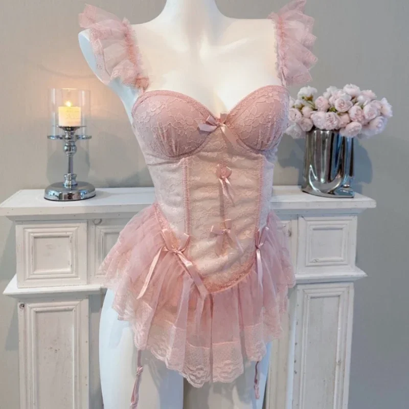 Black Vintage Corset Bustier Top Womens Lace Underbust Ruffles Sexy Lingerie Corset Push Up Bra Ladies Thong G-String Underwear
