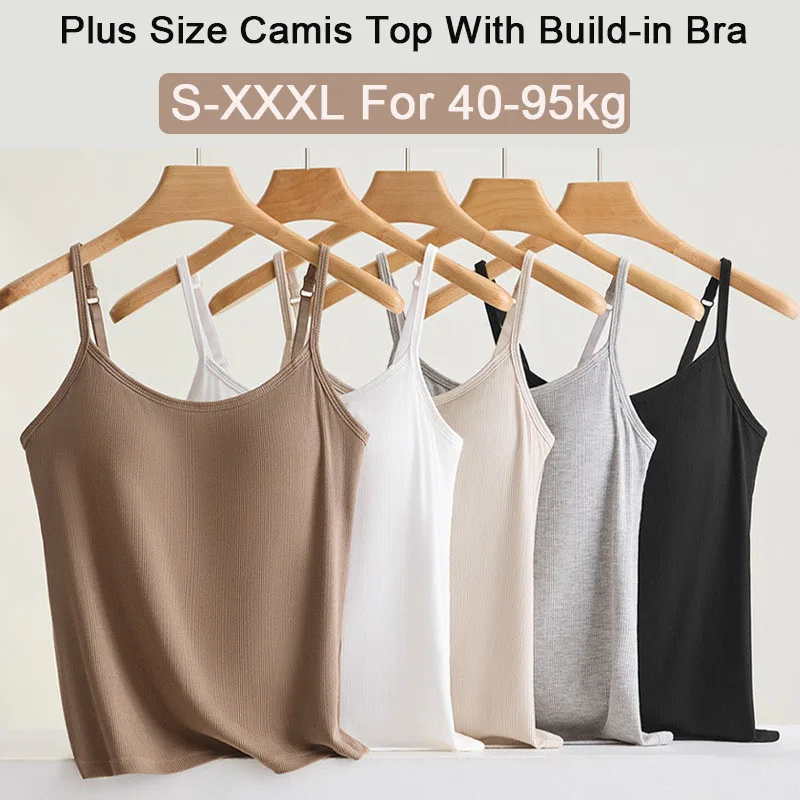 New Threaded Cotton Texture High Elastic Camisole Top with Build-in Bra Slim Bottom Sling Round Neck Fixed Cup Breathable Top  Read more