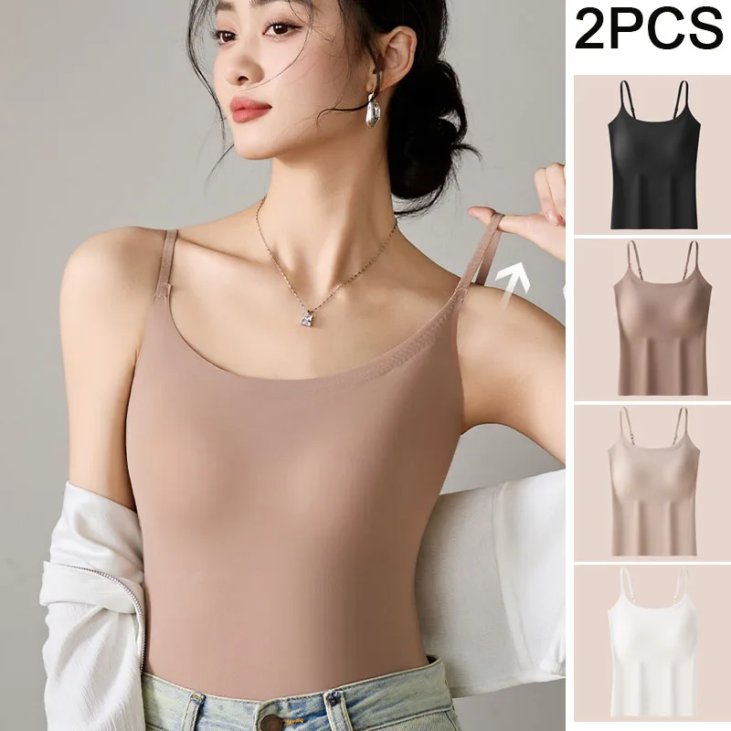 2PCS Seamless Spaghetti Camisole Top with Build-in Bra Women's Thin Fixed Cup Breathable Beautiful Back Sling Underwear